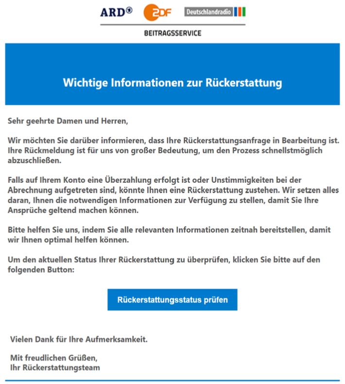 (Stand: 18. Oktober 2024) Mit dem Logo von ARD ZDF Deutschlandradio Beitragsservice behaupten Kriminelle in einer E-Mail, dass den Empfänger:innen eine Rückerstattung des Rundfunkbeitrags zustehen könnte. Sie sollen auf den Button "Rückerstattungsstatus prüfen" klicken, um persönliche Daten zu nennen und weitere Informationen zu erhalten.