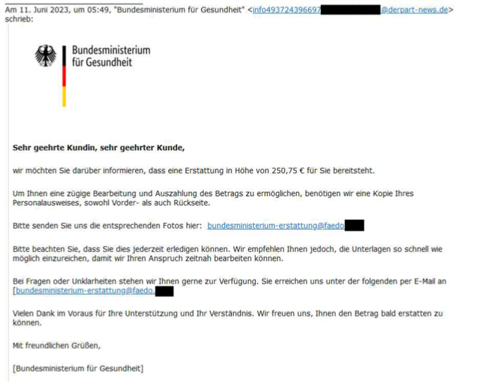 (Stand: 12. Juni 2023) Beim Bundesministerium für Gesundheit stehe angeblich eine Erstattung von mehreren hundert Euro bereit. Um sie zu erhalten, soll man den eigenen Personalausweis kopieren und unverschlüsselt per E-Mail versenden. Dass die E-Mail nicht vom Ministerium stammen kann, ist schon an der Absenderadresse zu erkennen. Außerdem würde kein Ministerium und keine Behörde dazu auffordern, Kopien wichtiger Dokumente unverschlüsselt per E-Mail zu schicken. Reagieren Sie nicht auf E-Mails wie diese!