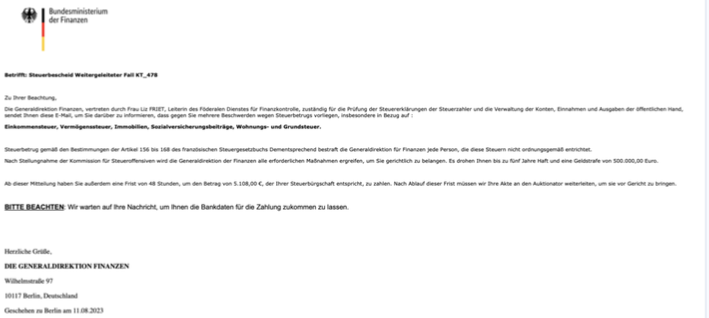 (Stand: 17. August 2023) Das Bundesministerium der Finanzen ermittle angeblich wegen Steuerbetrugs. Das soll diese E-Mail ausdrücken, die mit dem Betreff "Steuerbescheid Weitergeleiteter Fall KT_478" beginnt. Der Inhalt ist verwirrend und enthält offensichtlich Übersetzungsfehler: "Die Generaldirektorin Finanzen, vertreten durch Frau Liz FRIET [...] sendet Ihnen diese E-Mail, um Sie darüber zu informieren, dass gegen Sie mehrere Beschwerden wegen Steuerbetrugs vorliegen." Man soll gegen Artikel 156 bis 168 des französischen Steuerrechts verstoßen haben. Dann wird mit bis zu fünf Jahren Haft und einer Geldstrafe von 500.000 Euro gedroht. Sollte man nicht innerhalb von 48 Stunden den Betrag von 5.108 Euro zahlen (dieser Betrag ist in den E-Mails unterschiedlich), müsse die Akte "an den Auktionator" weitergeleitet werden. Um die Bankdaten für die Zahlung zu erhalten, soll man eine Nachricht senden.