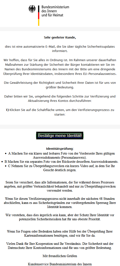 (Stand: 8. August 2023) Mit dem Bundesadler und dem offiziellen Titel "Bundesministerium des Innern und für Heimat" wird eine E-Mail verschickt, in der behauptet wird, dass das Ministerium die Identität prüfen müsse. Dazu soll man auf einen Link klicken, der beschriftet ist mit den Worten: "Bestätige meine Identität!". Er führt auf eine ausländische Internetseite, die nicht vom Ministerium stammt und von diesem auch nicht betrieben wird.
