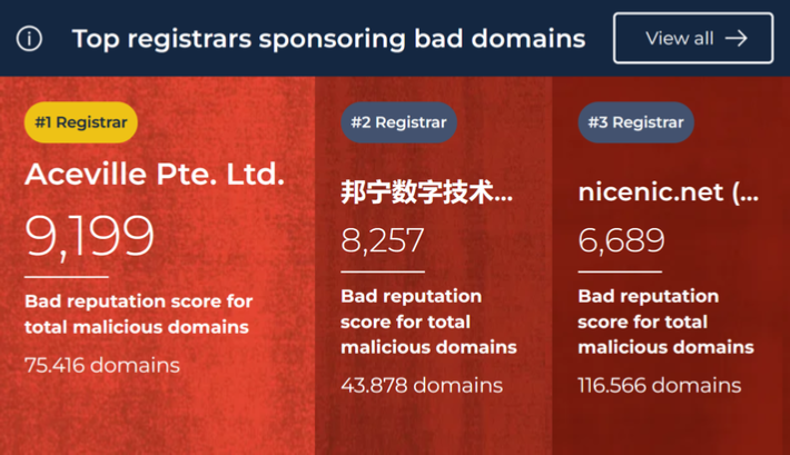 Doch nicht nur die Registries, auch die Domain-Registrare bekommen ihr Fett weg. Laut Spamhaus ist der US-Registrar Namecheap am beliebtesten bei Cyberkriminellen, und das schon traditionell: