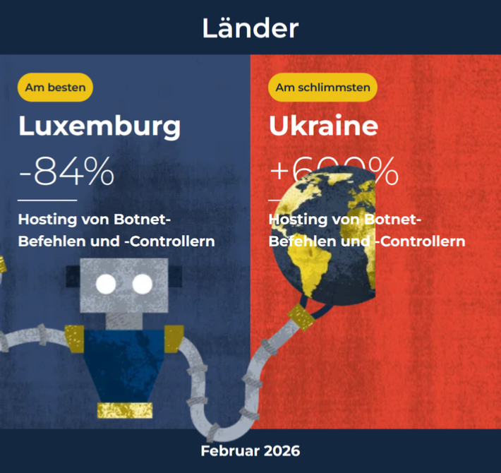 Laut Stand vom 26.02.2026 hat das Spamhaus Project bekanntgegeben, dass die Ukraine mit +60% beim Hosting von Botnet-Befehlen und -Controllern am Schlimmsten ist.